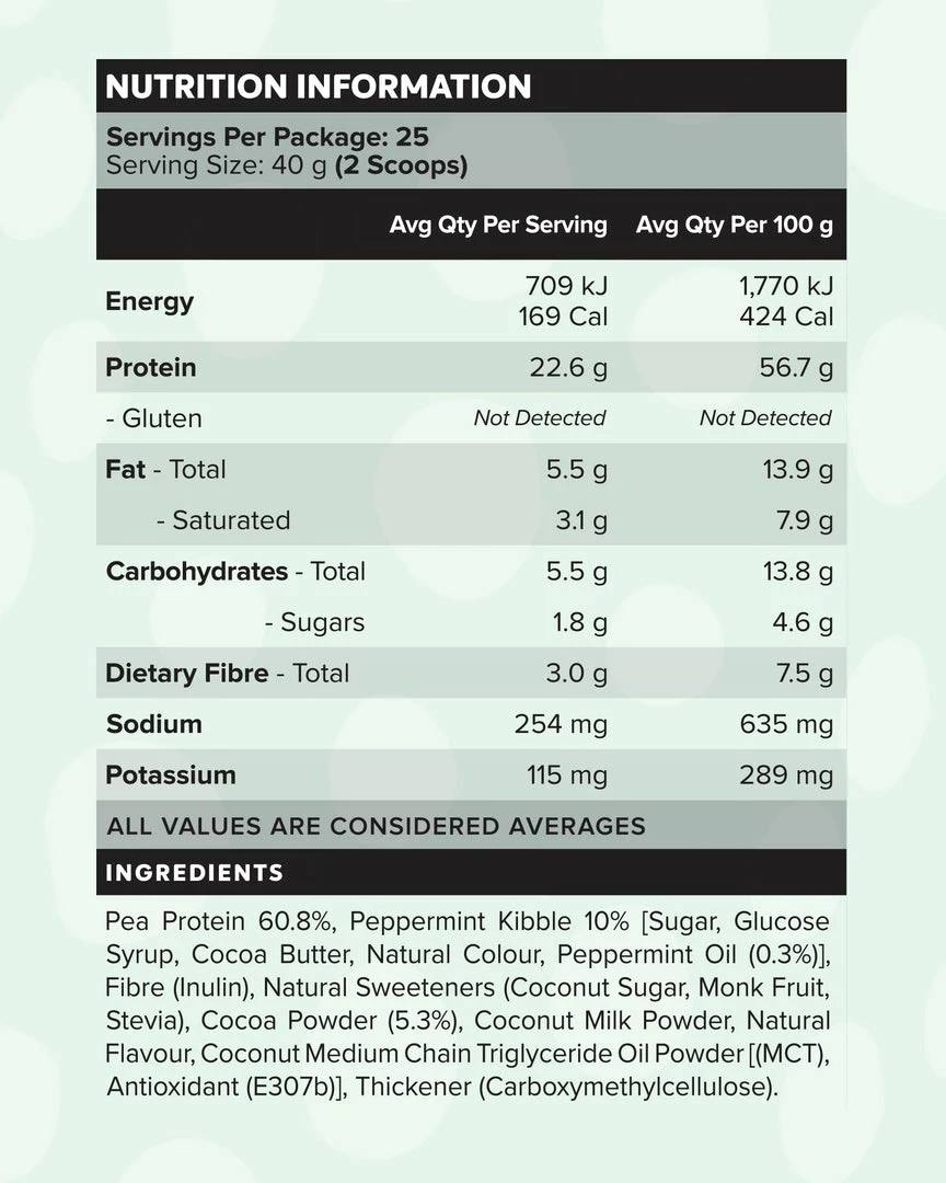Rich and creamyย Choc Mint Custardย Plant Protein Powder, with mint crisp pieces.