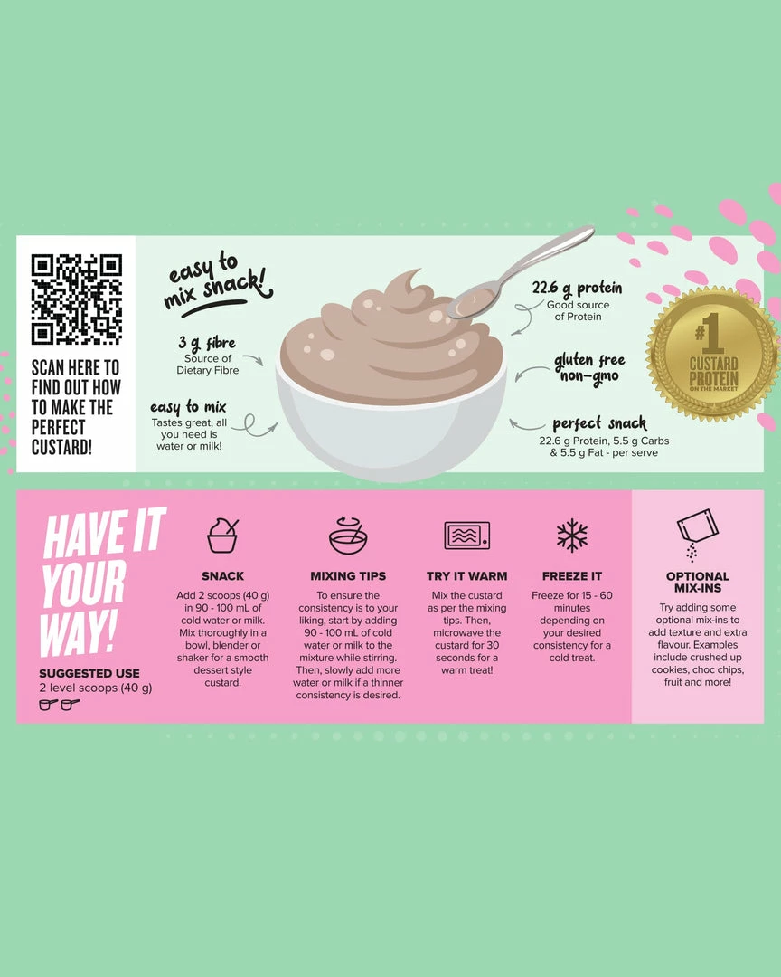 Just add water or your preferred milk and you will have ready-to-eat smooth custard with the added benefits of plant protein and fibre. Great on its own, or get creative and mix in your favourite fruits, nuts or granola for a little added crunch. Itโs the ultimate natural protein snack or vegan friendly treat to satisfy those sweet tooth cravings.ย