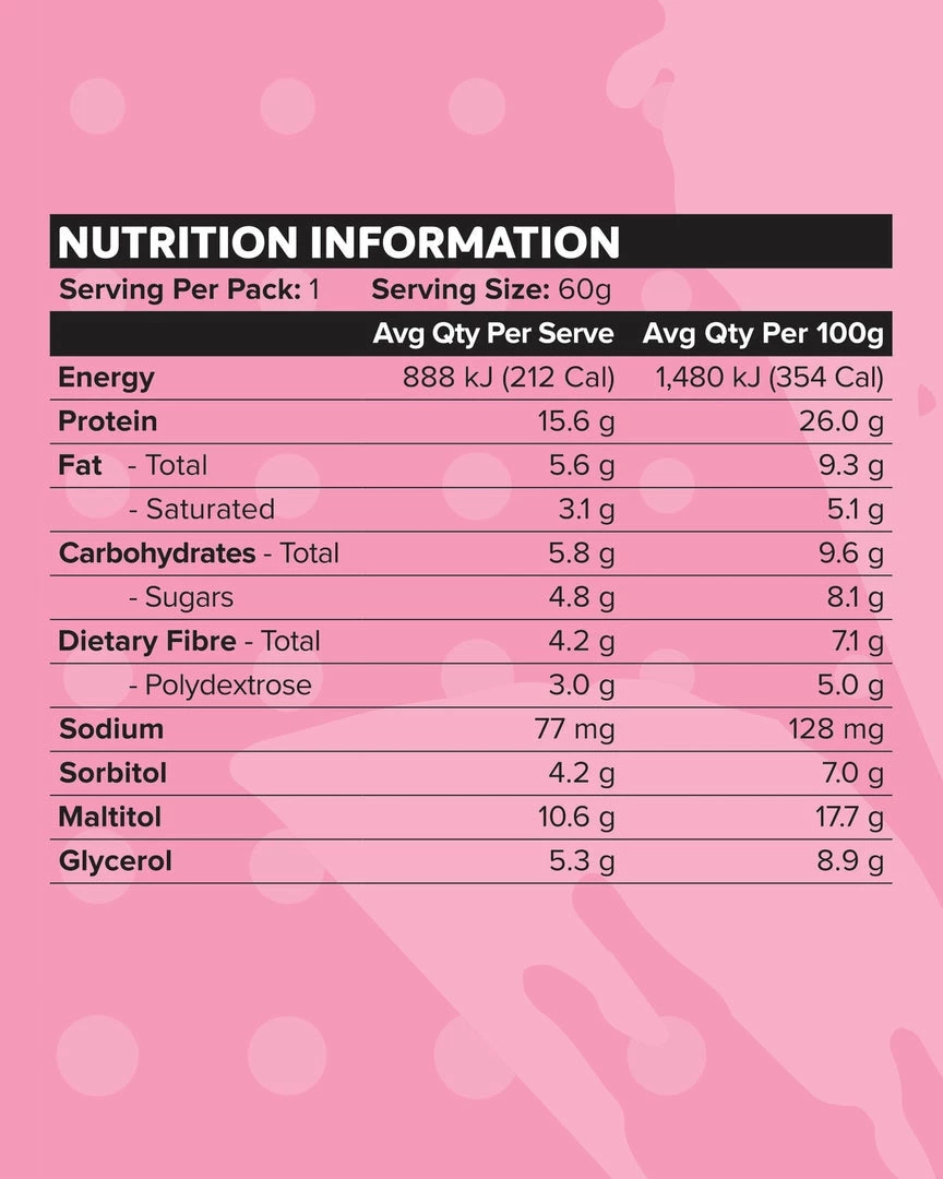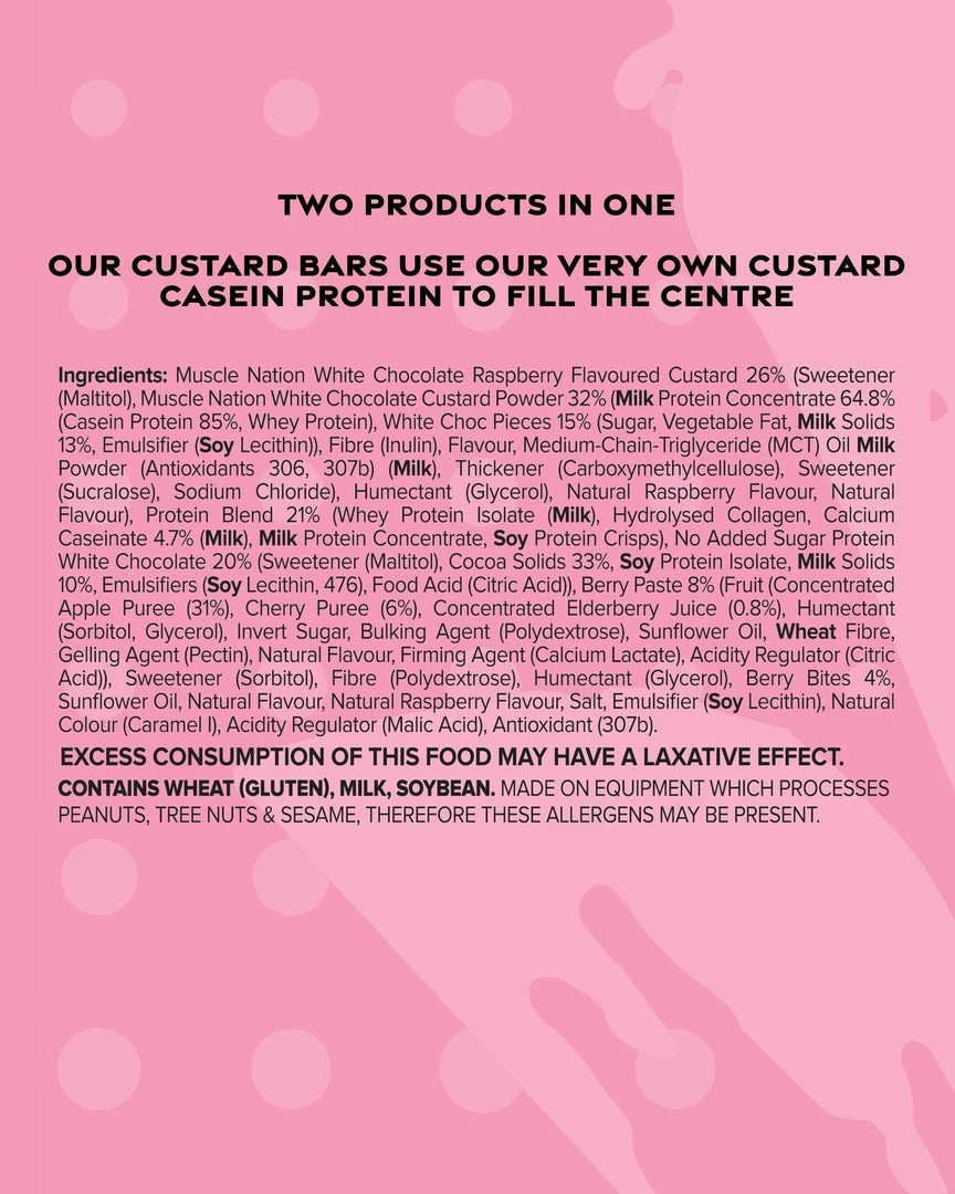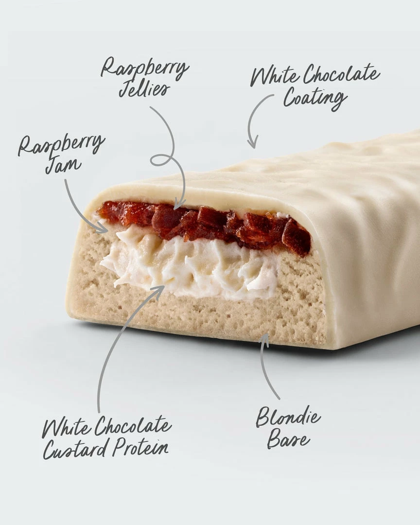 A mouth watering protein bar featuring a smoothย white chocolate custard layer with an extra layer of gooey raspberry jam, sprinkled with chewy berry bitesย and coated in a lush layer of white chocolate. Itโs the ultimate protein packed snack made with our renowned Custard Protein.