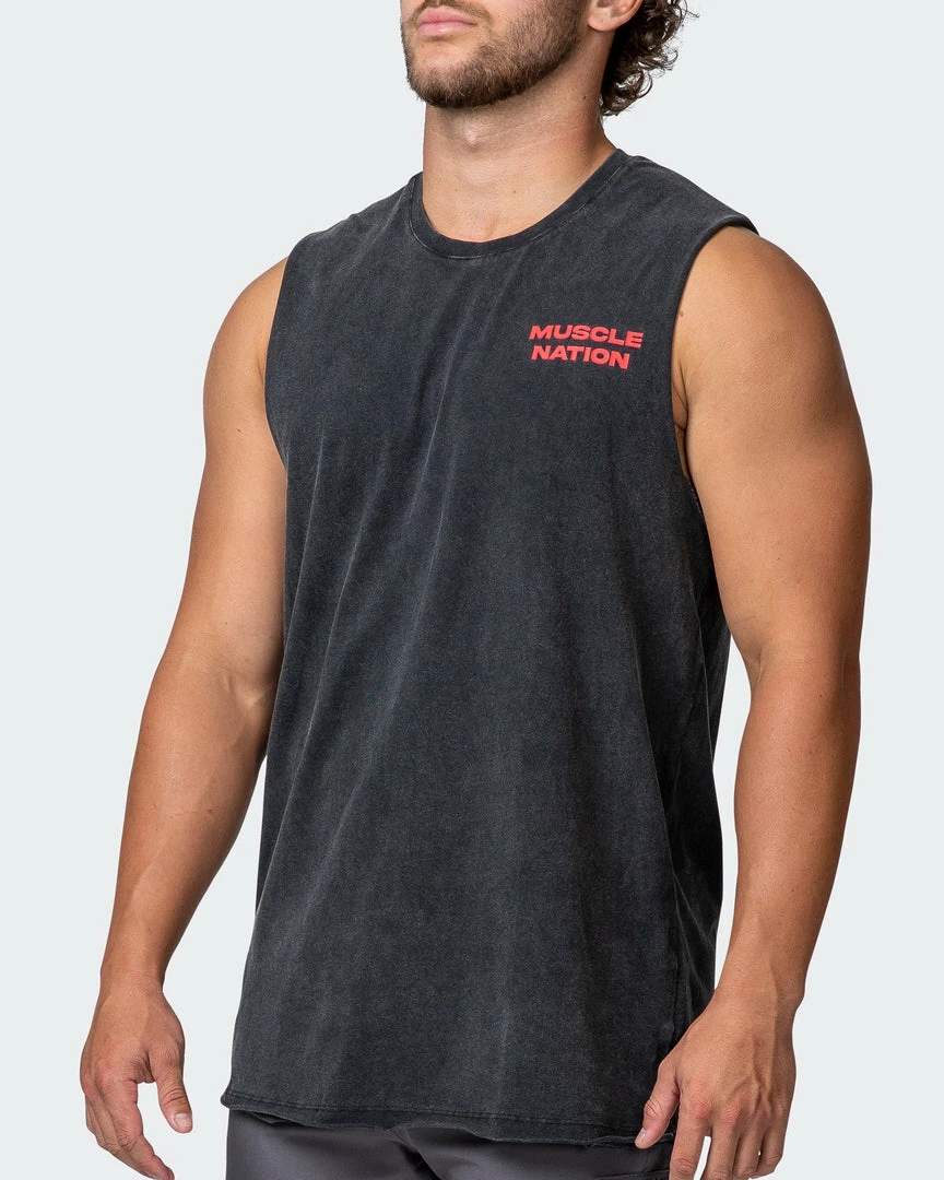 Details include a distressed acid wash base and bold Muscle Nation branding.ย