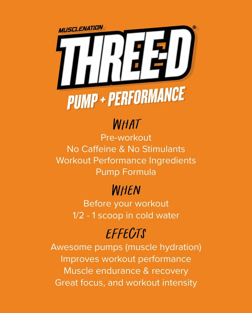 If you are sensitive to caffeine but still want all the benefits of a pre-workout (minus the caffeine), then Three-D is for you.ย Three-D is packed with all the goodies like Citrulline, Glycerol, Agmatine and more.