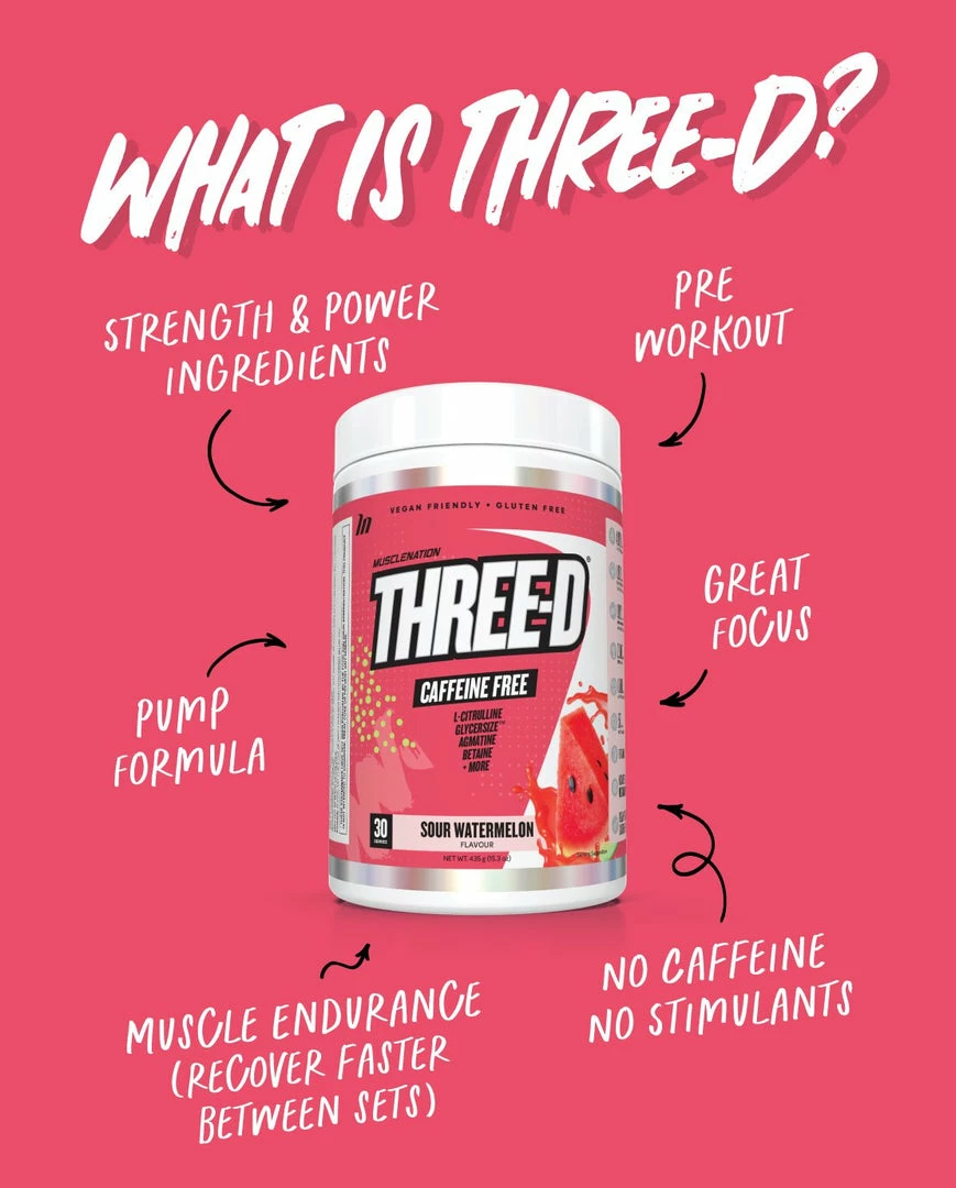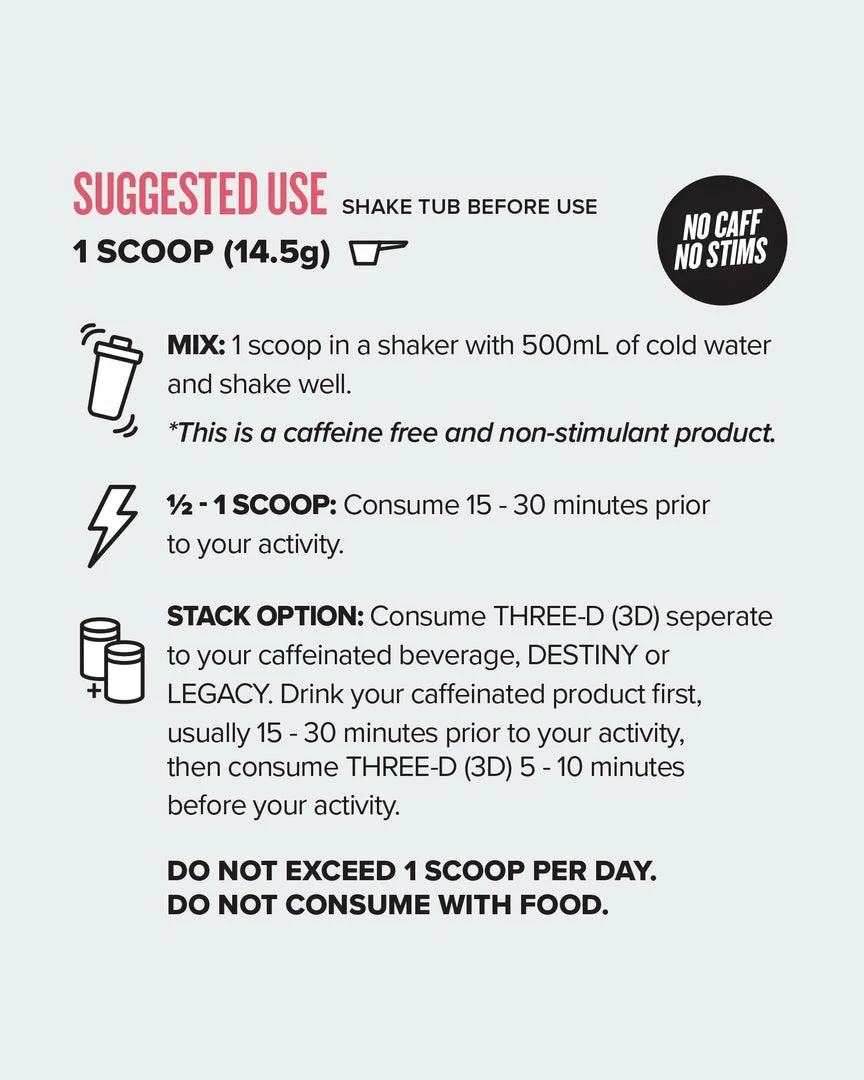 Three-D is our caffeine free pre-workout for anyone who wants that extra push and pump, but without theย jitters and anxiety.