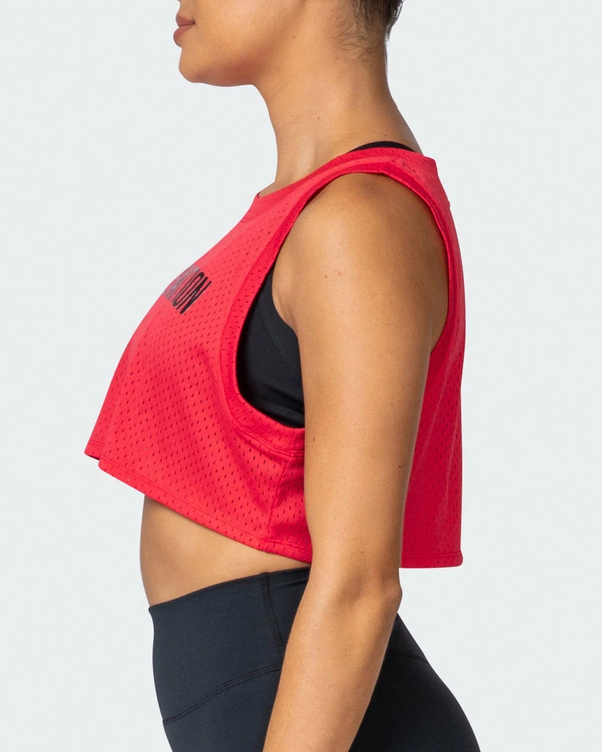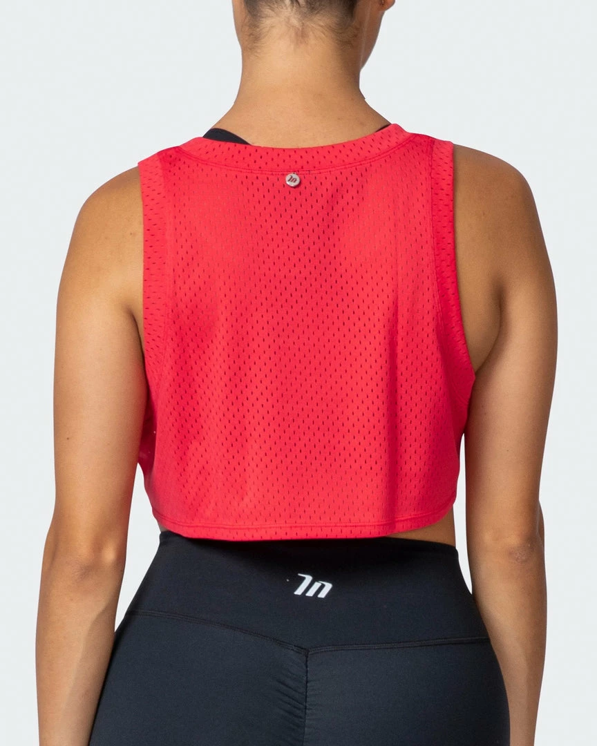Details include an ultra cropped length, crew neckline and drop arm holes.
