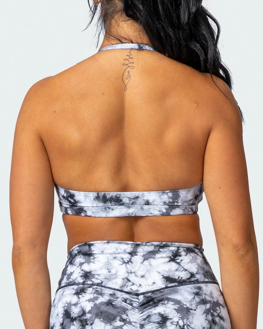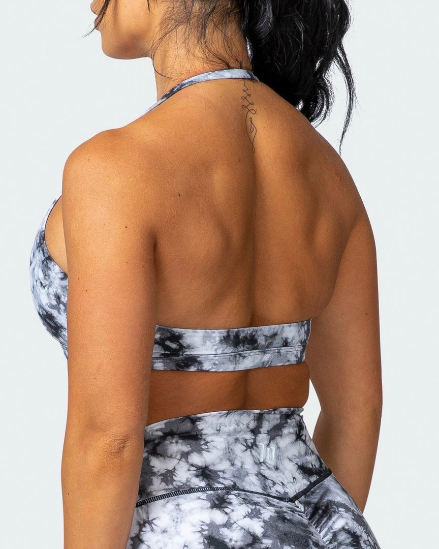 Details include a halter strap around the neck and an encased, elasticated waistband.