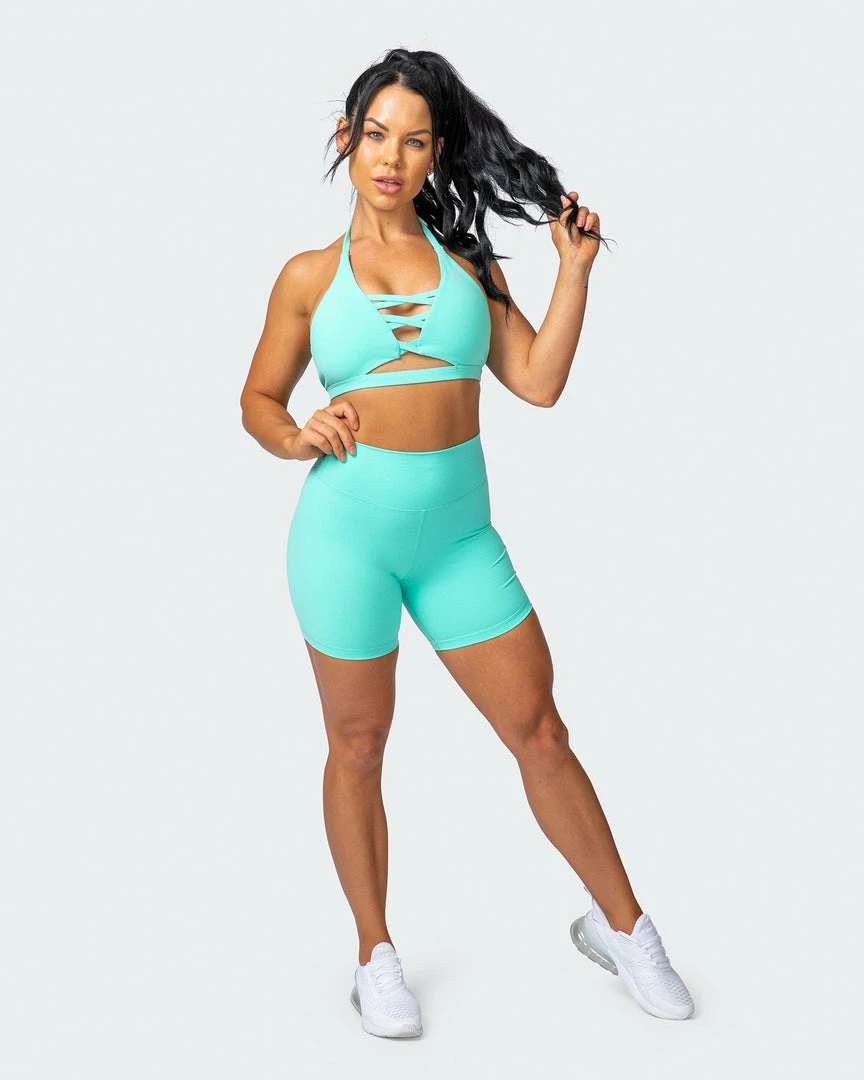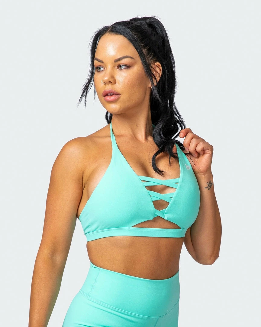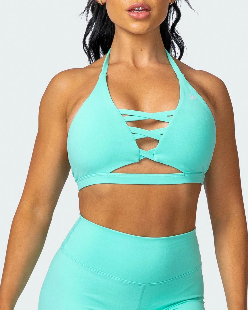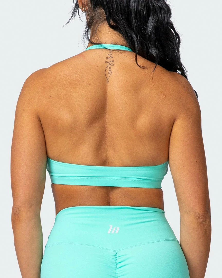 Details include a halter strap around the neck and an encased, elasticated waistband.