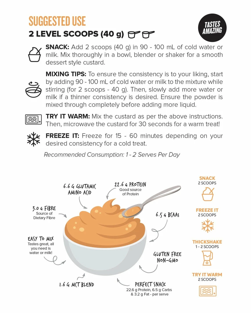 Our Custard Casein Protein is quick and easy to make, all you need is water or milk! With a smooth and creamy consistency, our Custard Protein is the perfect breakfast, snack or a night time treat. Our Custard Protein tastes amazing and is a good source of protein.