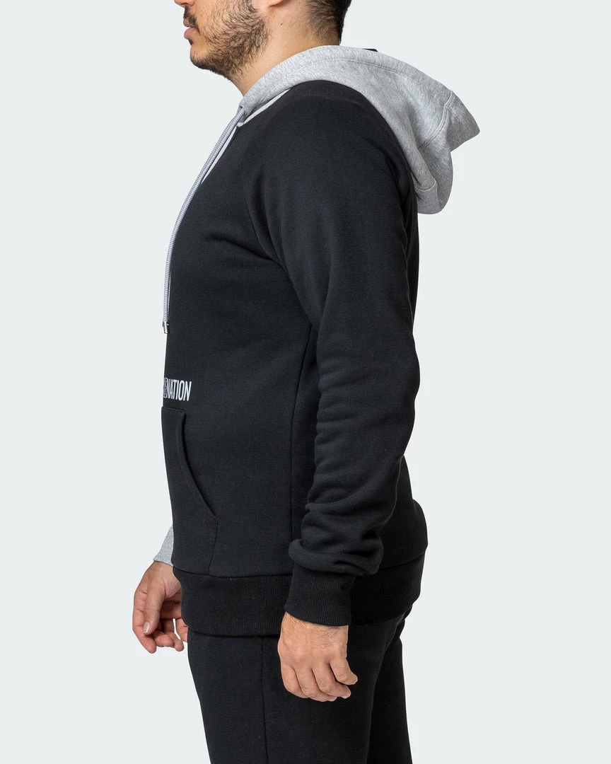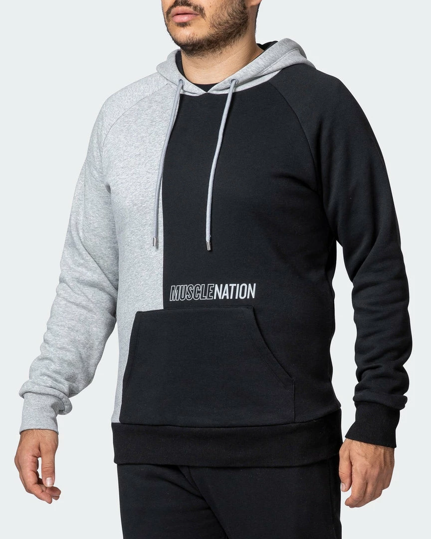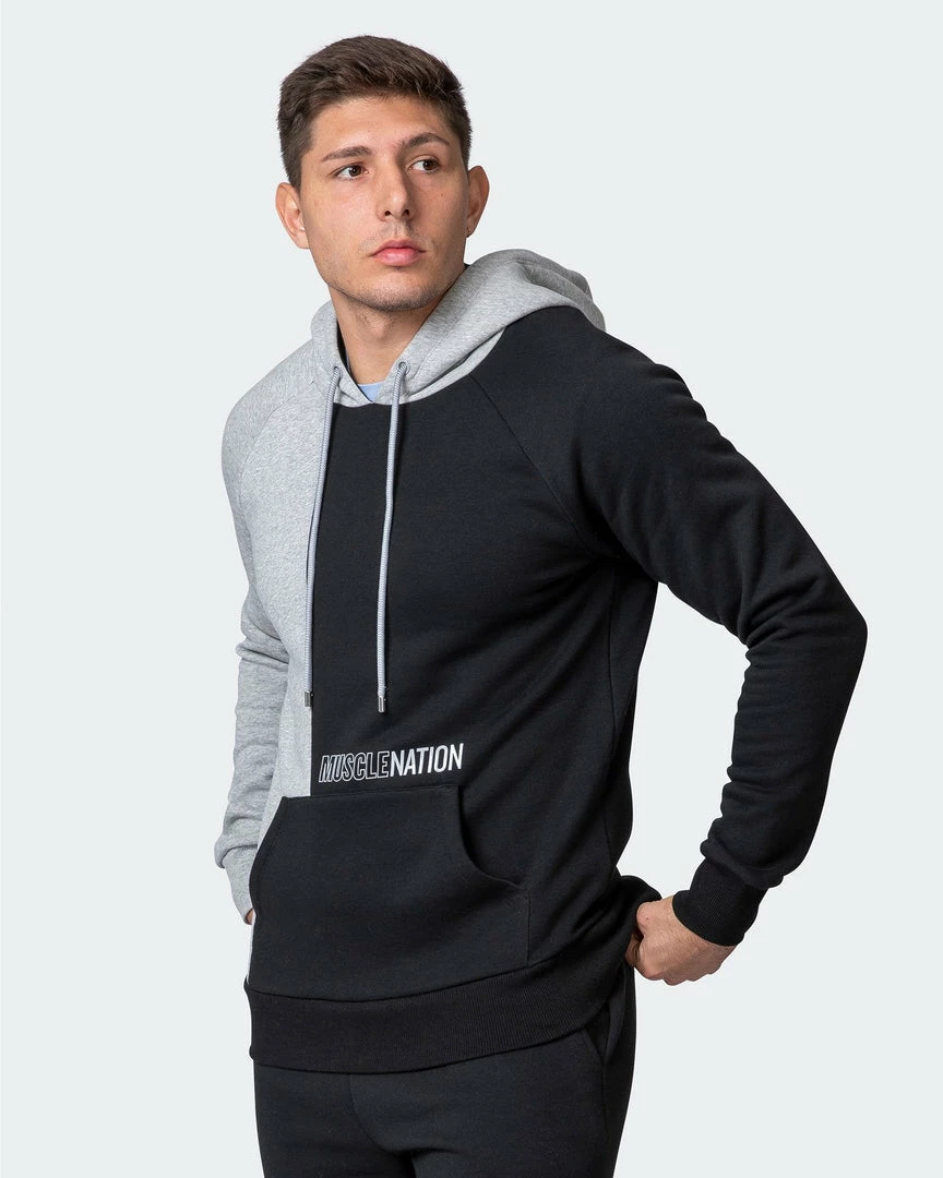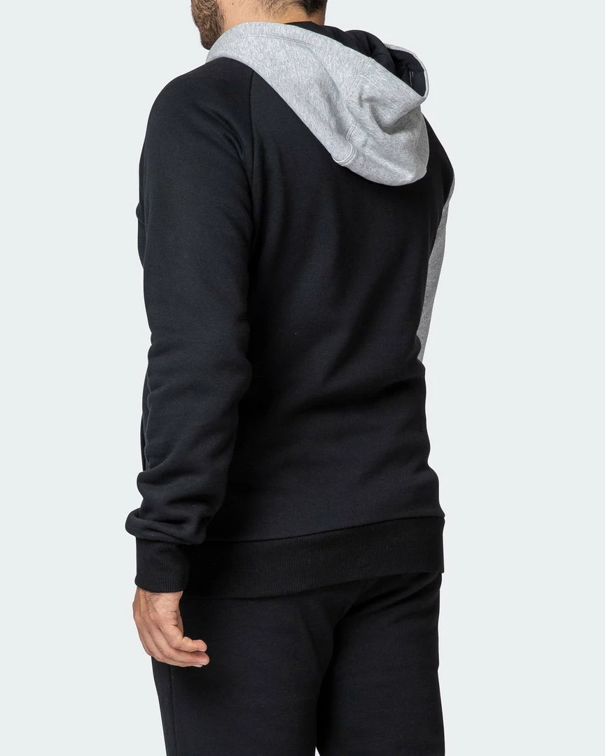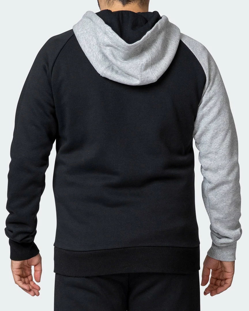 Details include a front patch pocket, ribbed trims, and contrast colour body and sleeve panels.ย