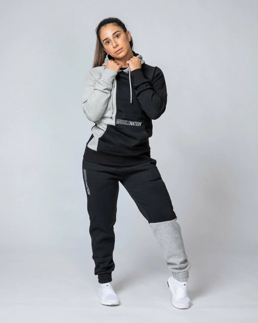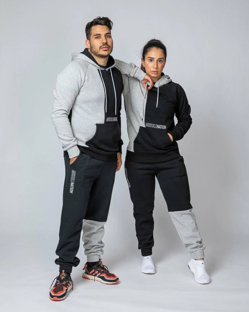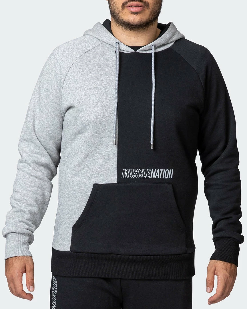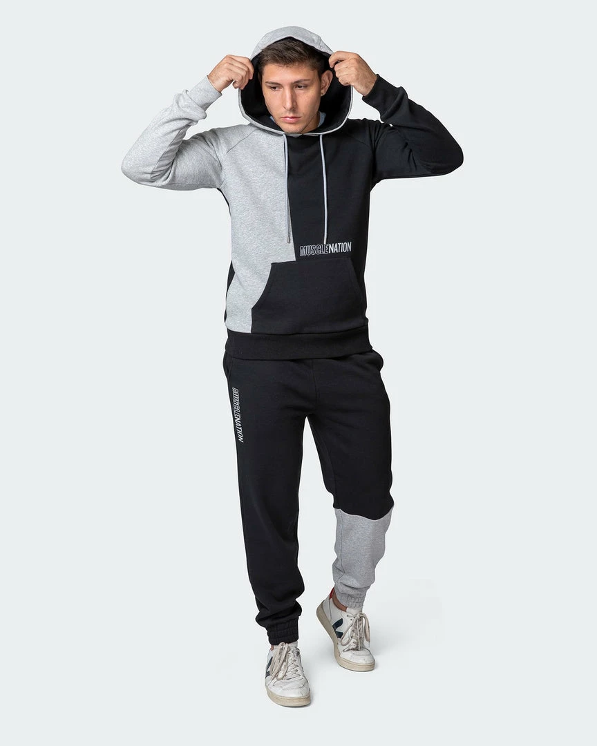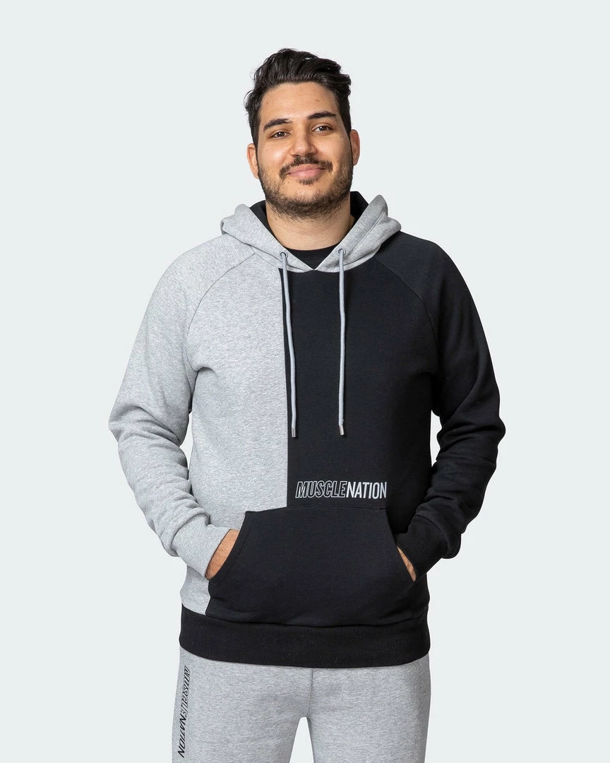 Details include a front patch pocket, ribbed trims, and contrast colour body and sleeve panels.ย