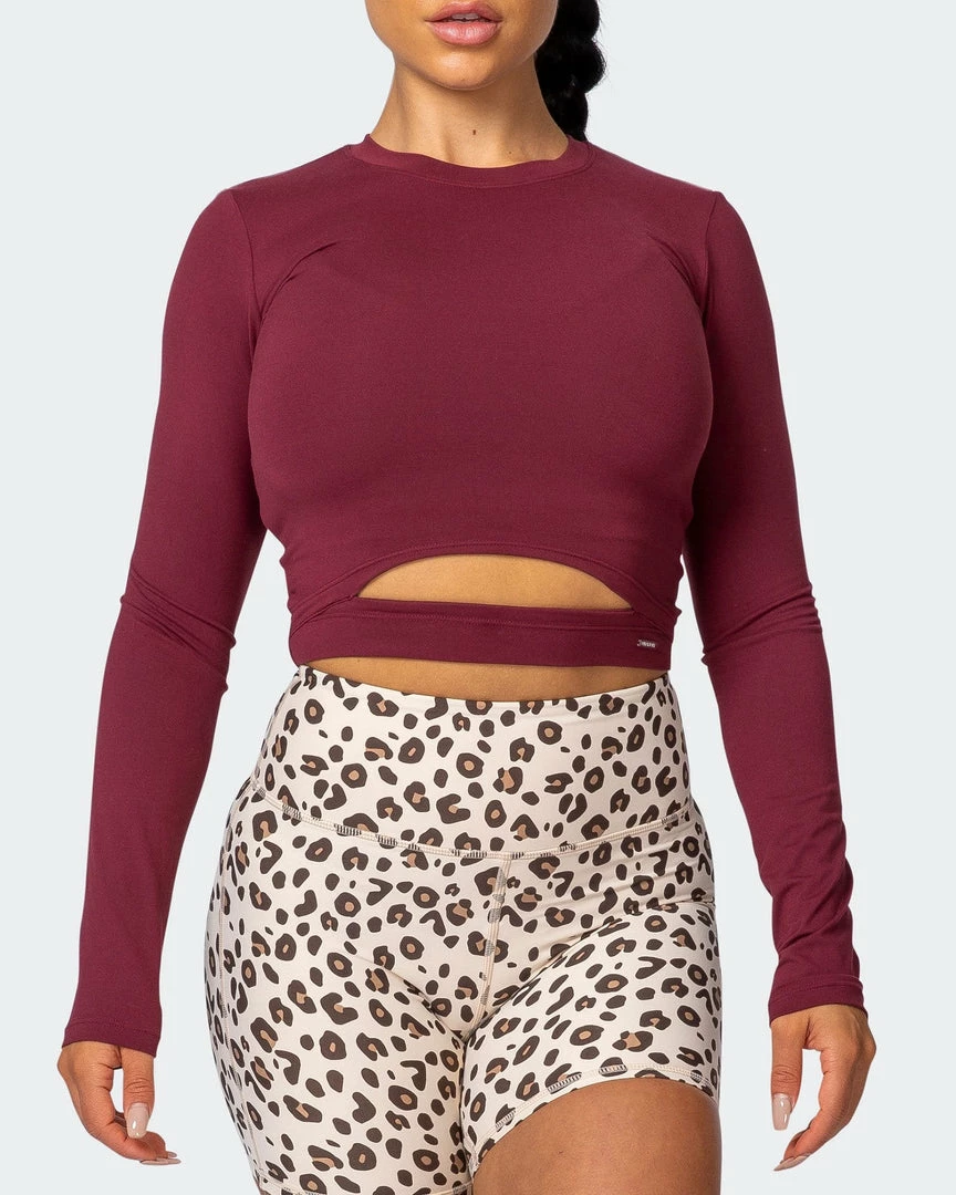 Details include a cropped silhouette, crew neckline and keyhole detailing on the front waistband.
