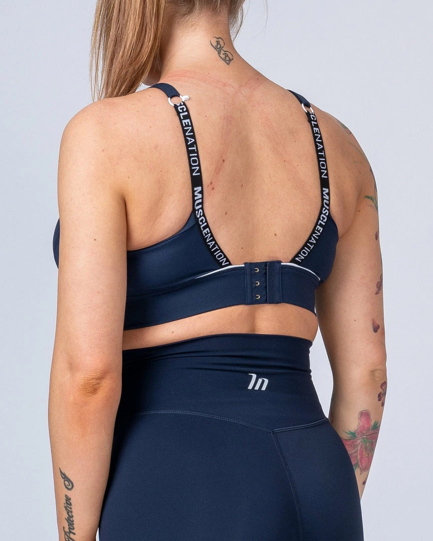 Details include luxe hardware, contrast piping and a customised Muscle Nation logo woven into the elastic back straps.