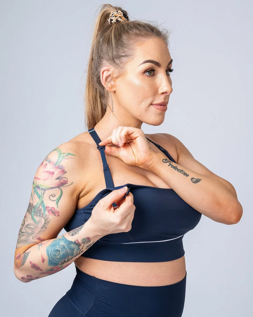 While this bra is supportive, it is not restrictive. Breastfeeding clips are practical and ideal for nursing pre or post workout.