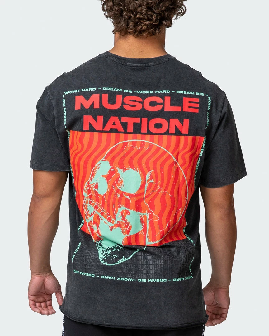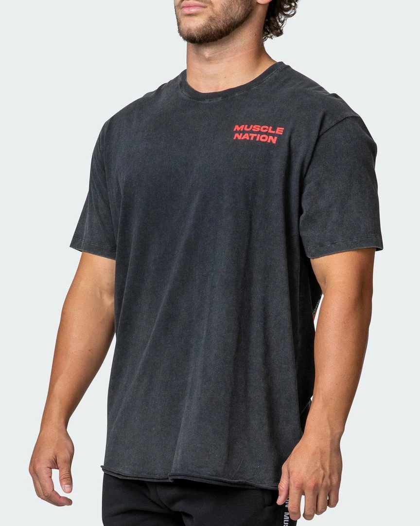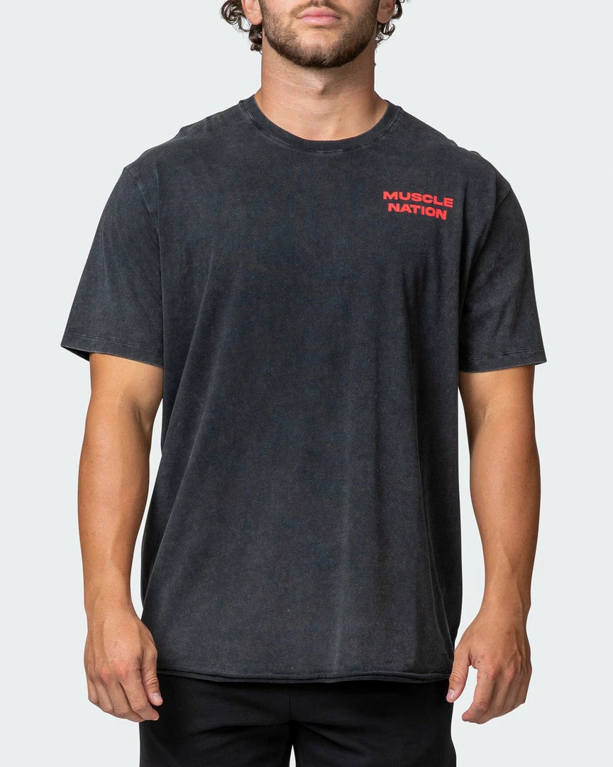 Details include a distressed acid wash base, bold Muscle Nation branding and drop shoulders for comfort.