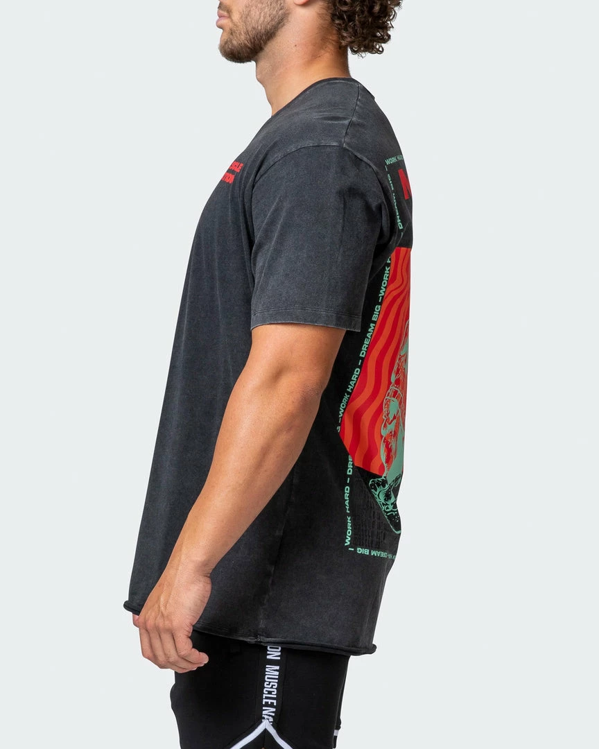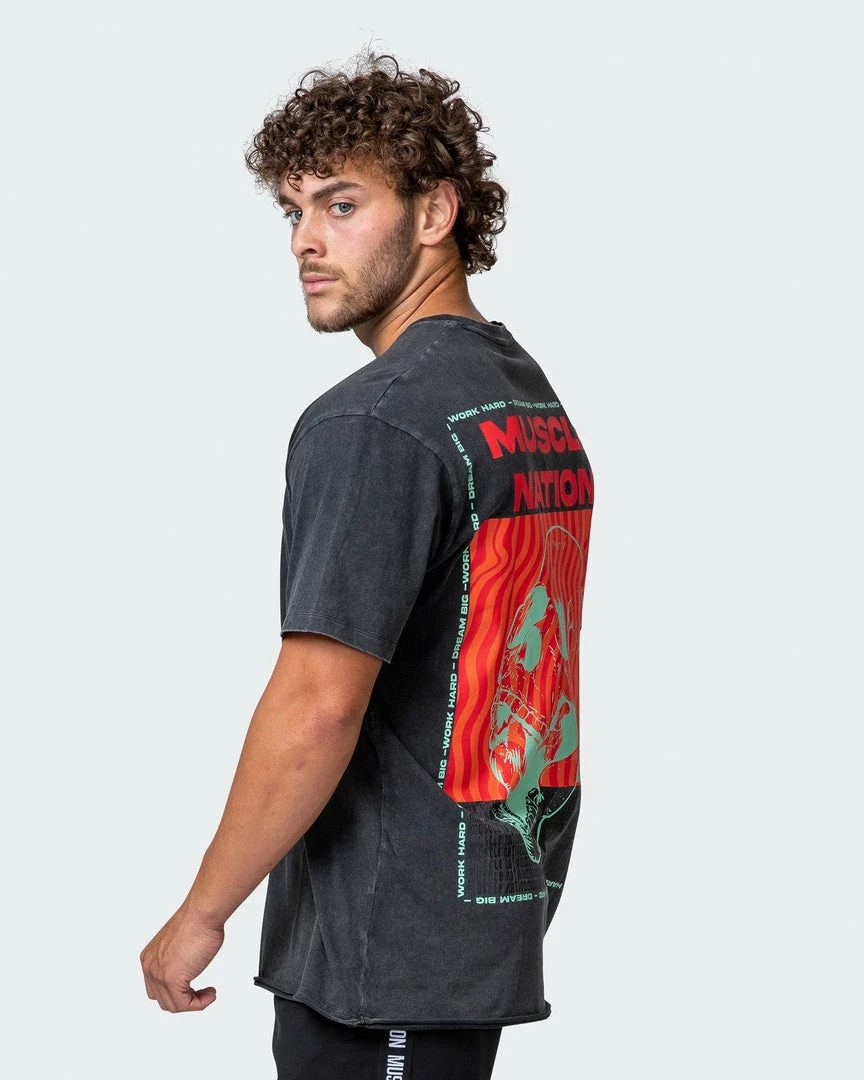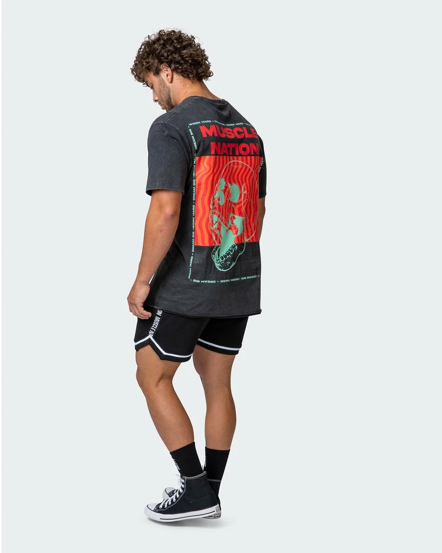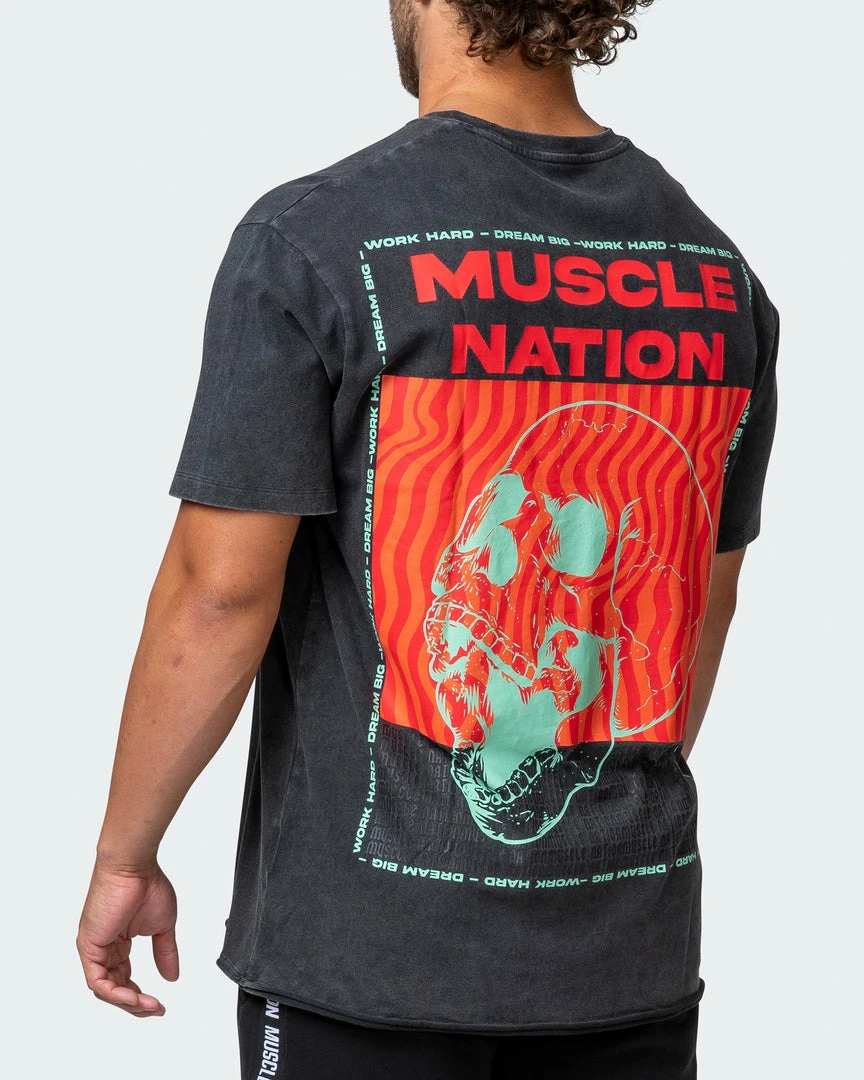 Details include a distressed acid wash base, bold Muscle Nation branding and drop shoulders for comfort.