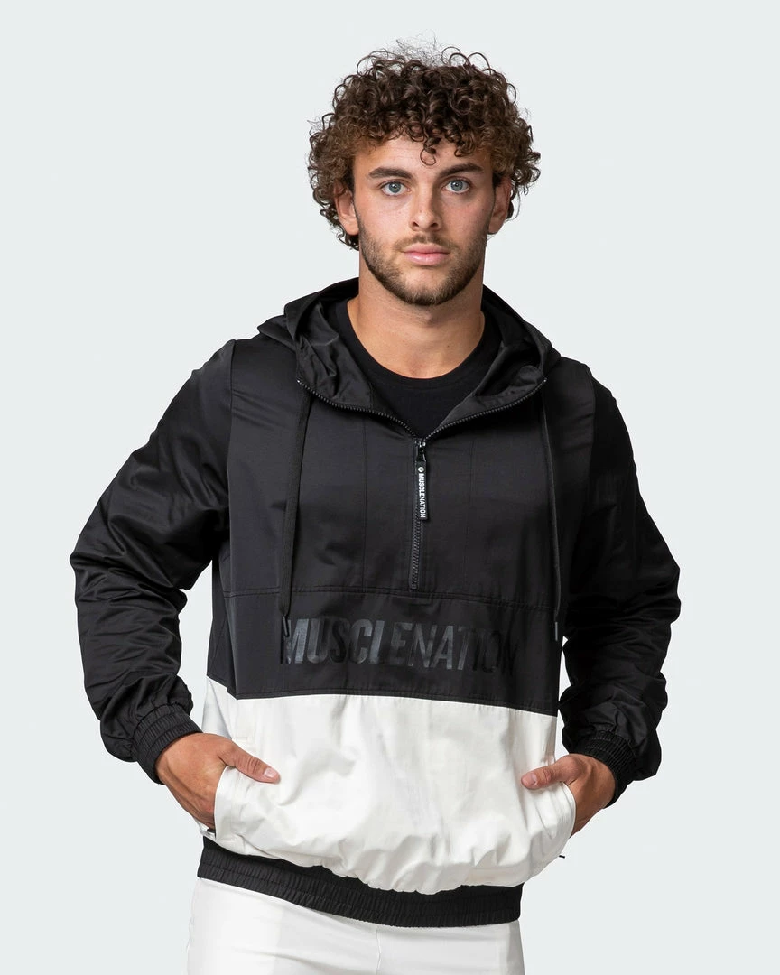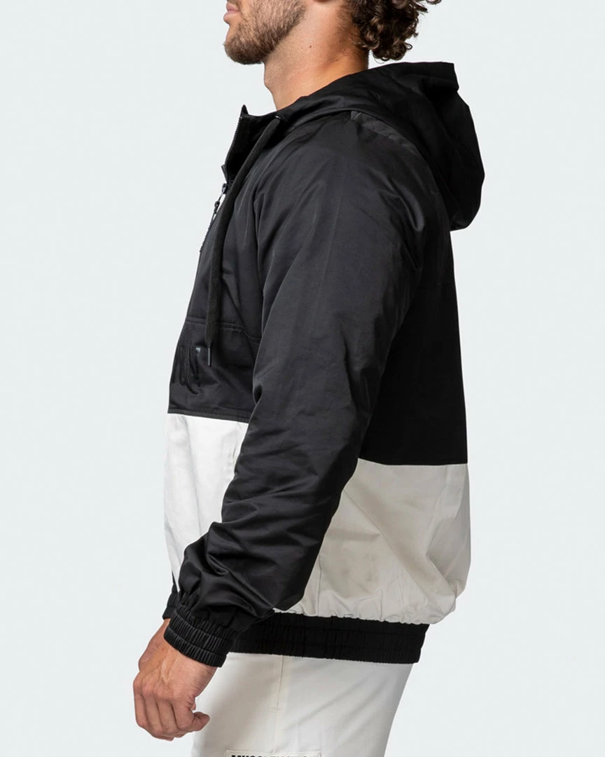 This windbreaker style jacket features a drawcord adjustable hood, front zippers into a pocket and comfortable encased elastic cuffs and waist hem.