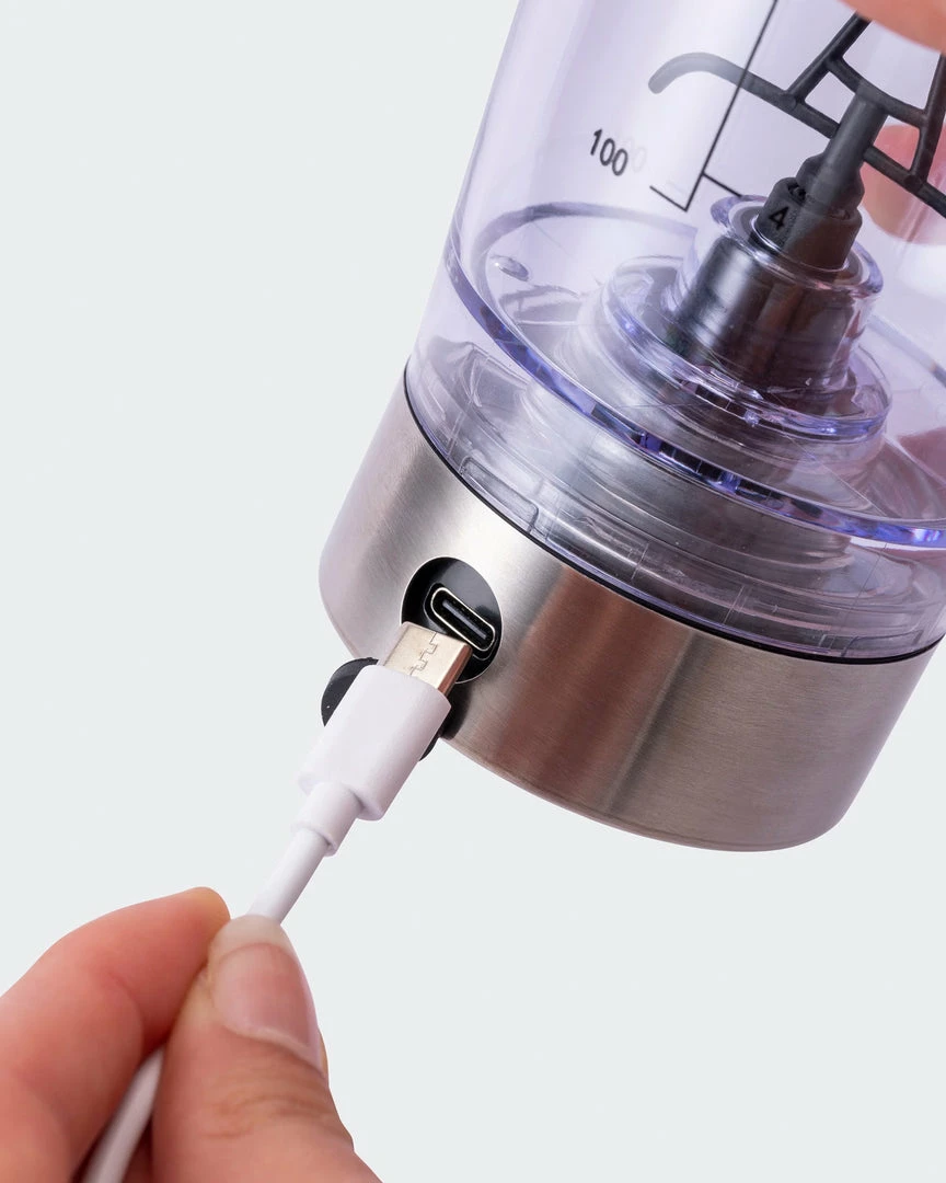 Hassle free method of mixing, a supplement mixer you must have. Clear shaker, USB charge (no batteries) and finished in metallic.