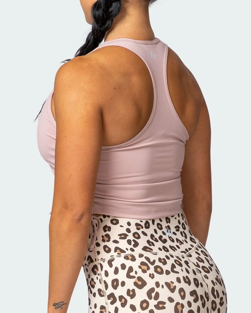 Features include a scoop neckline, and racer back.