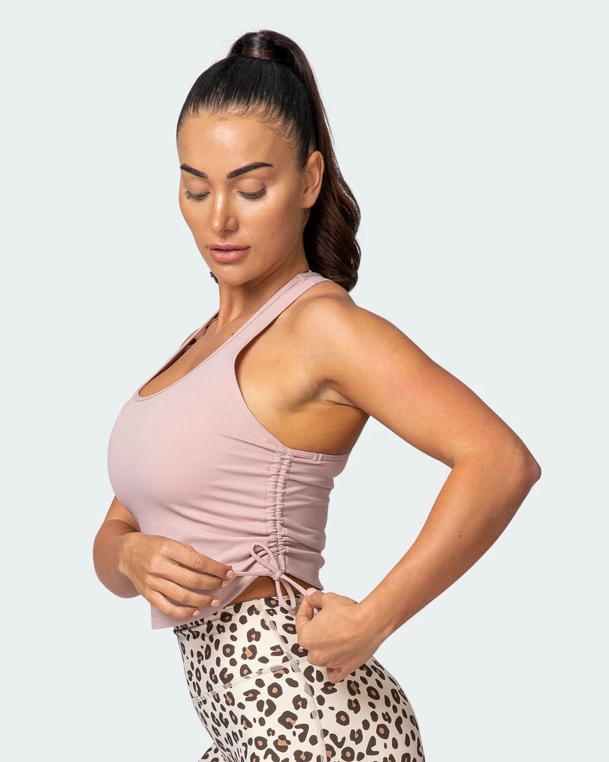 Using the ruched side ties, you can adjust the length higher for more of a cropped look.ย