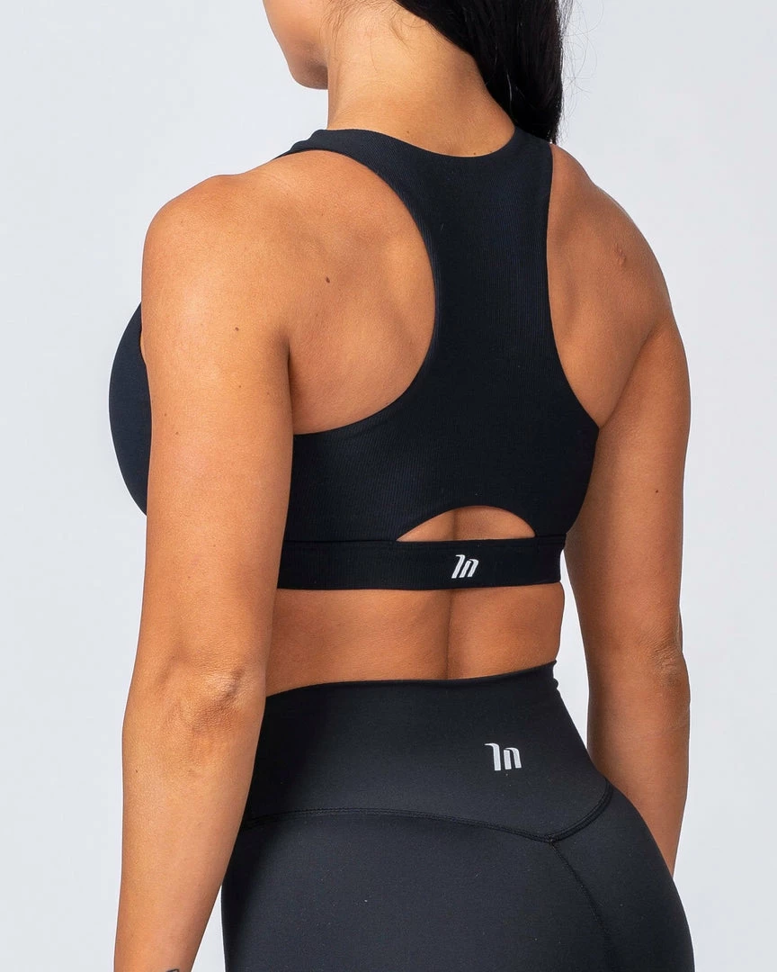 The keyhole, racer back design of this piece also encourages ventilation while training.ย