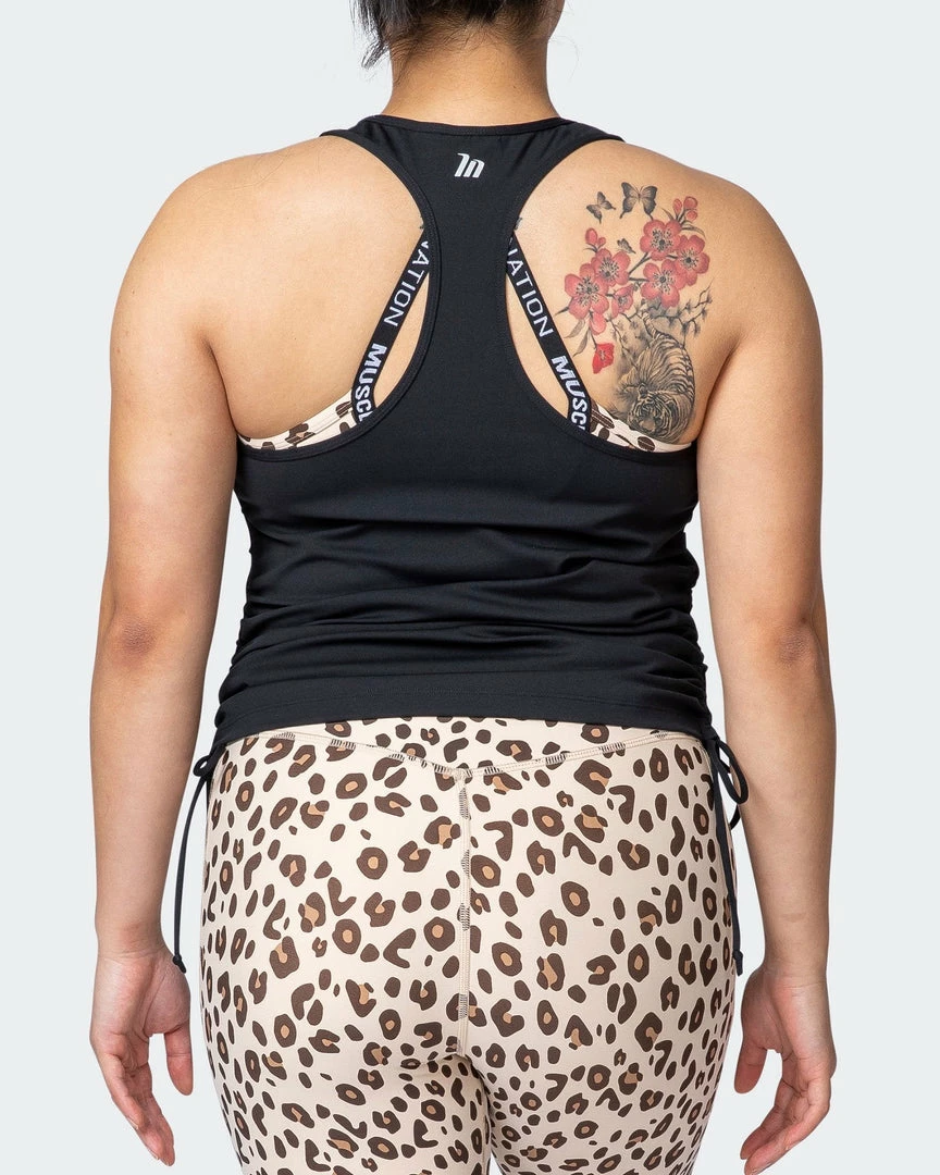 Use the side ties to adjust the length lower to sit around your hips, or a little higher to cinch your waist and lower back.