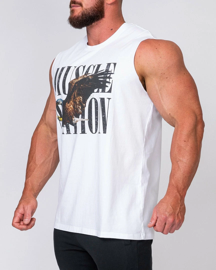 Featuring aย boldย eagle design and on-trend, raw cut arm holes – this tank is all about personality.ย