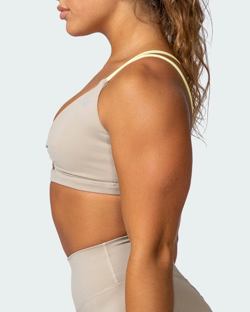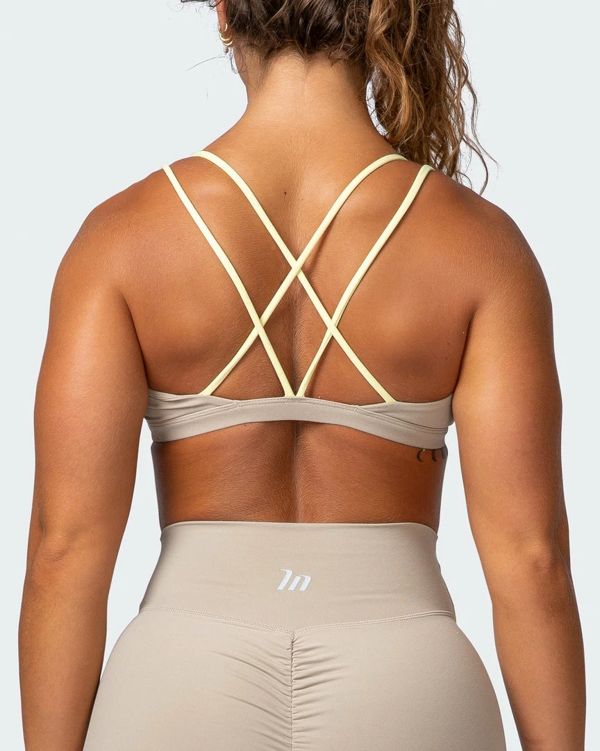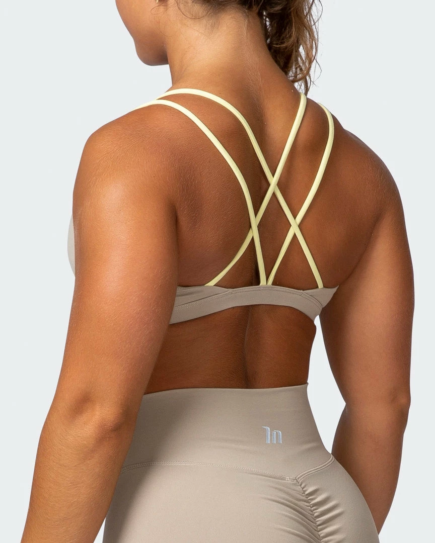 Featuring a twist front with keyhole design and contrast criss-cross straps, this bra has you covered!