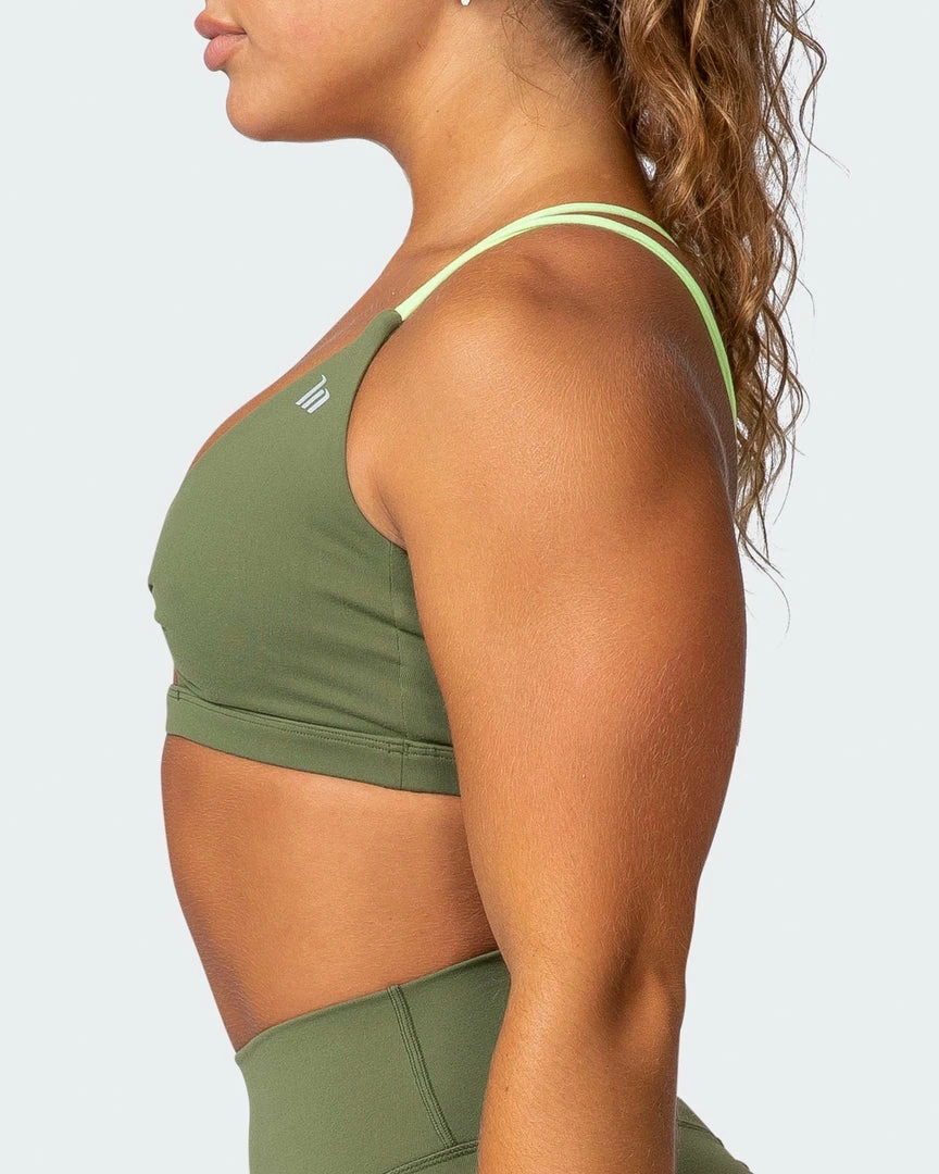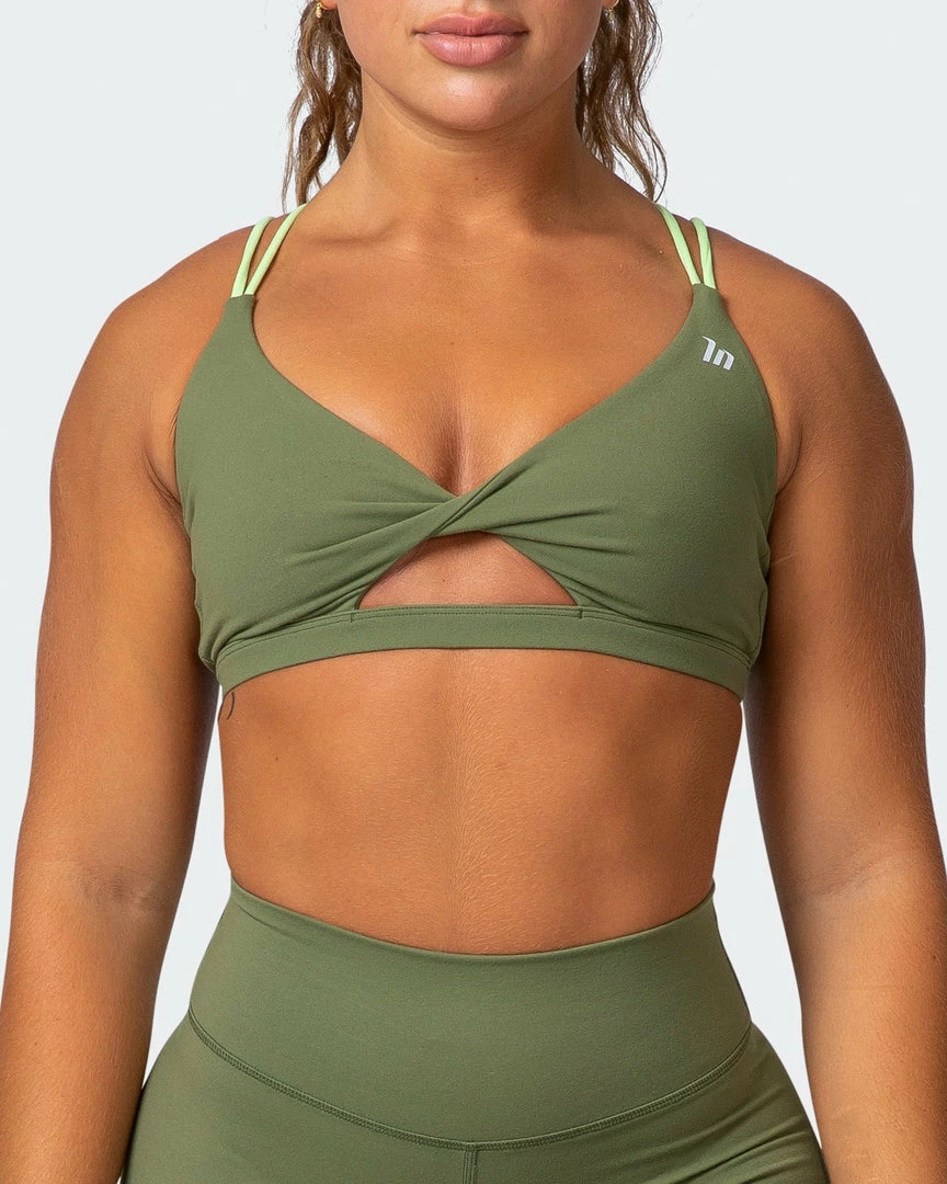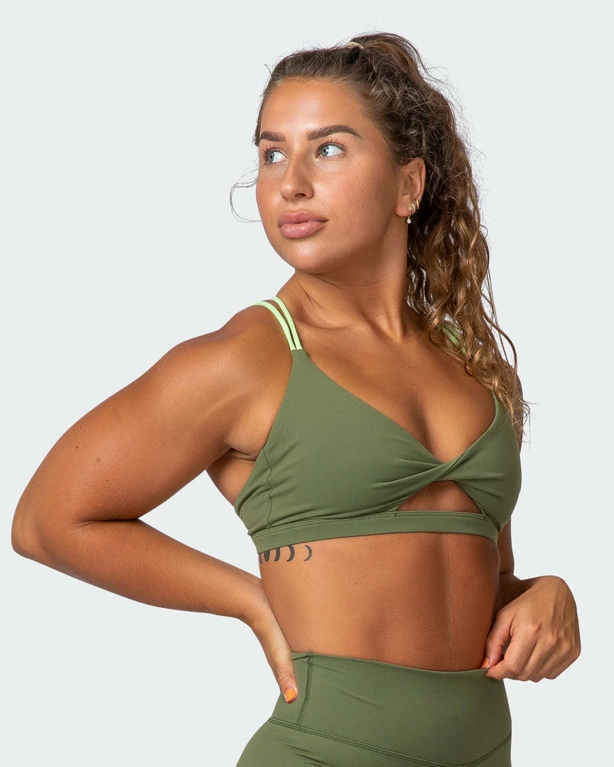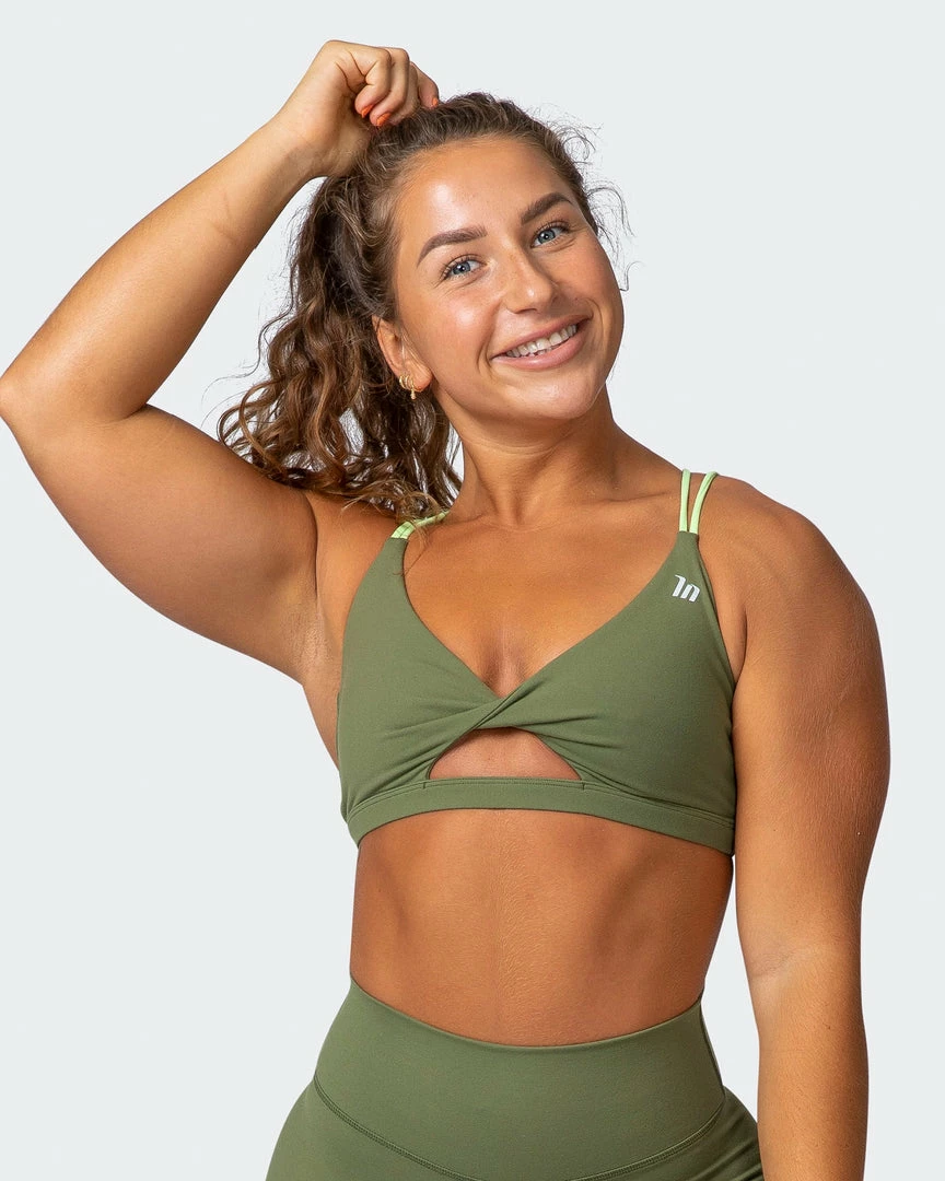 Featuring a twist front with keyhole design and contrast criss-cross straps, this bra has you covered!