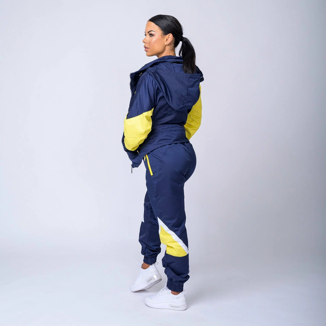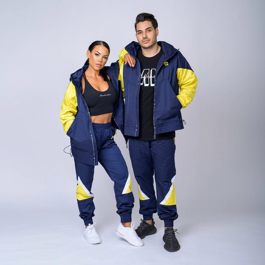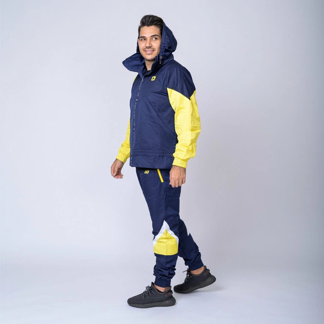 Featuringย yellow side panelling, embrace being bold,ย warmย and comfortableย in thisย retro-inspired outfit.ย An elasticated waistband with drawcords allows these bottoms to beย customised for fit and practicality. A frontal-zip, funnel neckline and fold away hood featureย contributes to this jacket’s warmth and practicality.ย